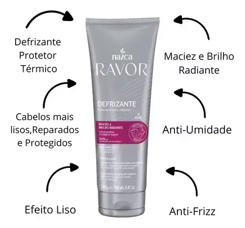 Defrizante termoativo Nazca Ravor Quartzo que protege e repara os fios antes do uso de secador e prancha. Com queratina e colágeno vegetal, alinha as fibras, reduz o frizz e deixa brilho intenso sem precisar enxaguar. Ideal para todos os tipos de cabelo.